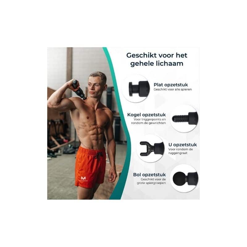 De Massagerr Massage Gun Professioneel wordt geleverd met 4 unieke massage koppen. Hiermee kan je vrijwel alle spiergroepen in het lichaam behandelen. Je krijgt: